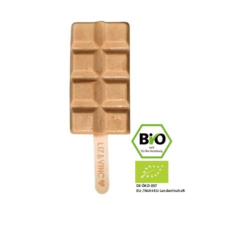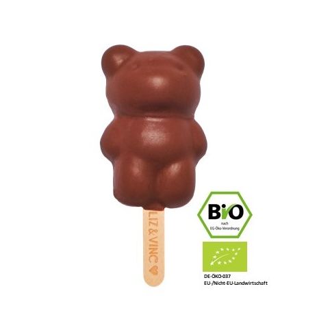 Der vegane Schokoladen Bär hat 60g und ist selbstverständlich vegan, auf Basis von Kokosmilch und wie all unsere Sorten 100% Bio.